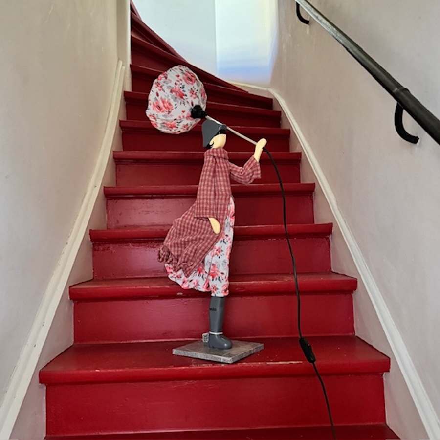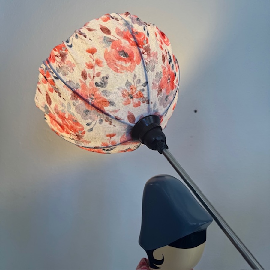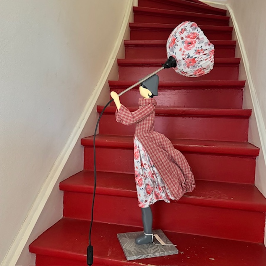 De paraplu dient hier als lampenkap en is gemaakt van metaal. De basis van de lamp, de vrouw, is gemaakt van hout wat vervolgens beschilderd is. Het doek van de paraplu is gemaakt van opgestijfd kaasdoek.
